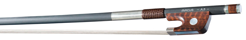 | Arcus A5: Sterling Silver Mountings, Pearl Eye, Silver/Black Lapping New from Arcus, combining the best of all their current Arcus models in one bow. Agile and well-balanced, the A-Series will suit the majority of players. If you are a soloist, considering looking at the S-Series also. If your instrument is overly bright, or you play in an orchestral situation, consider also checking out the M-Series. A-Series has: the light weight of the S-Series for enhanced agility, speed and comfort - including the typical, elegant Arcus frog the flexibility of the M-Series for ease of play the perfectly balanced sound of the P-Series, which gives the most beautiful sound for the majority of instruments. Comes in Round Stick only. About classifications: The A-Series goes from 4-9. The class-4 bows are a match for very high quality wood bows. The finest wood bows we have ever experienced in competition with an Arcus bow could sometimes equal a class-5, but rarely a class-6 bow. The 7- to 9-category bows pull a sound sweeter and more powerful than anything else ever put to a string. a-Series are available in 4-9 class. 66 gms. |