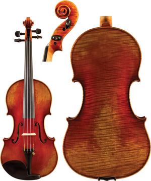 | Body Length - 354 mm, Upper Bout - 167 mm, Lower Bout - 206 mm Fitted with ebony parisian eye pegs and endbutton, ebony tailpiece, Despiau "B" level bridge, and Guarneri model ebony chinrest. Dominant A, D, & G strings with Pirastro Wondertone Gold E (loop end). Price includes an adjusted and ready to play instrument. |